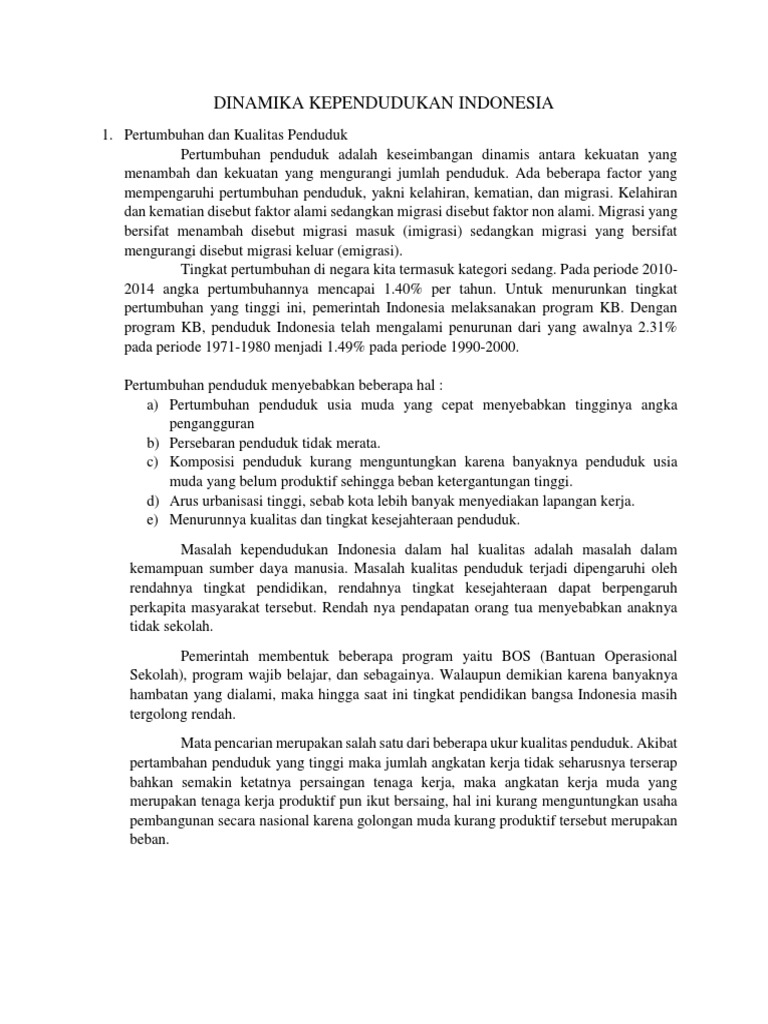 Program Kualitas Penduduk Pemerintah - Indikator Pencapaian. Berbicara tentang kualitas penduduk berarti menyangkut dengan mutu kehidupan dan kemampuan sumber daya manusianya. Faktor yang memengaruhi kualitas penduduk. Untuk menurunkan tingkat pertumbuhan yang tinggi ini, pemerintah indonesia melaksanakan program keluarga berencana. Pertumbuhan penduduk adalah keseimbangan dinamis antara kekuatan yang menambah dan kekuatan yang mengurangi jumlah penduduk. Program peningkatan kompetensi kepemimpinan kepala sekolah dalam rangka meningkatkan mutu pendidikan.